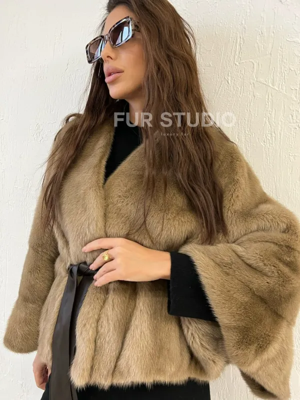 Мех данной шубы аукционная норка, цвет бежевый. Предлагается в размерах от 42 до 56. Длина модели 50-55 см, что выгодно подчеркивает фигуру девушек. Эта модель идеально подойдет для девушек и женщин, предпочитающих роскошные натуральные меха.
