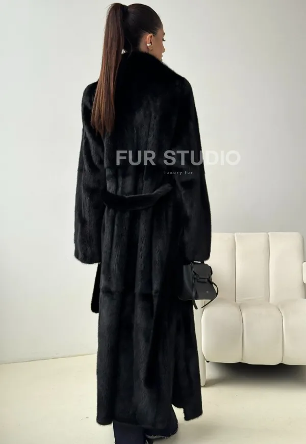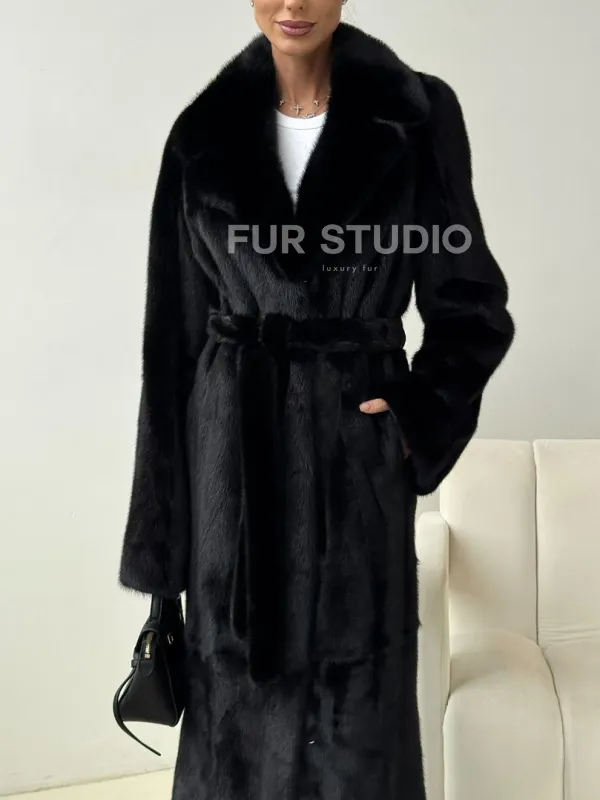 Черная норковая шуба с поясом 102453