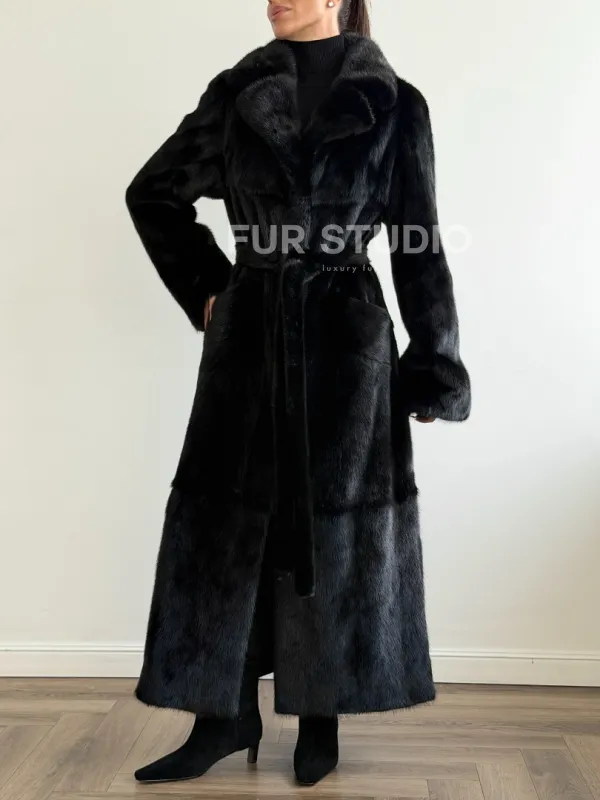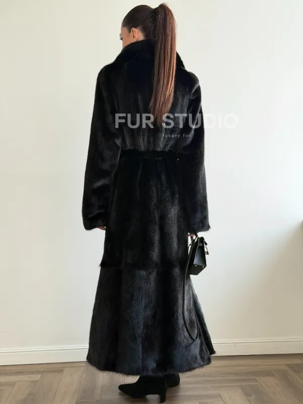 Мех данной шубы аукционная норка , цвет черный. Предлагается в размерах от 42 до 48. Длина модели 125-130 см, что выгодно подчеркивает фигуру девушек. Эта модель идеально подойдет для девушек и женщин, предпочитающих роскошные натуральные меха.