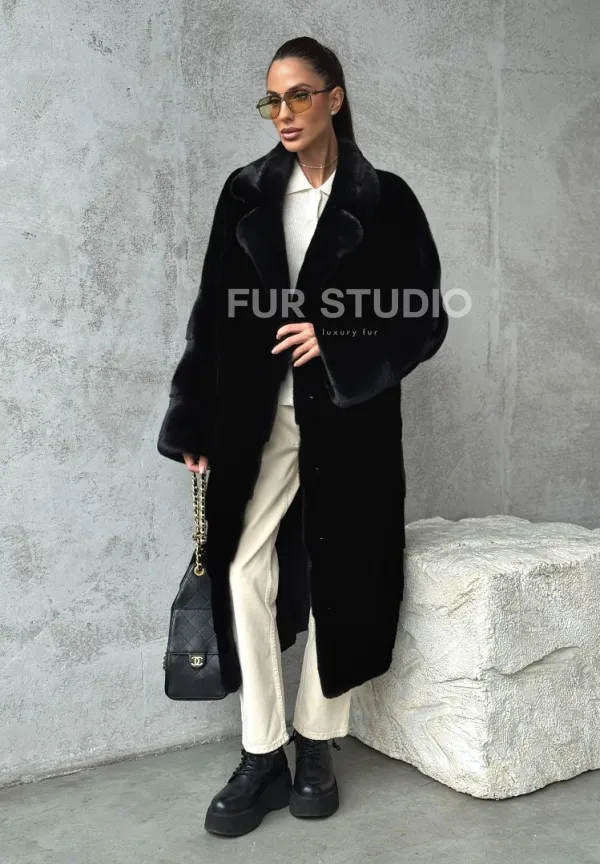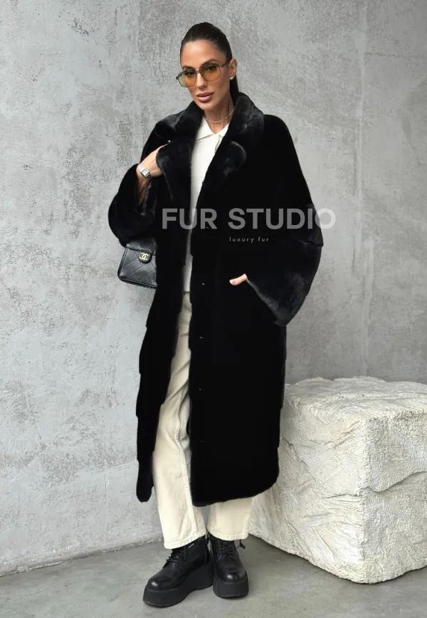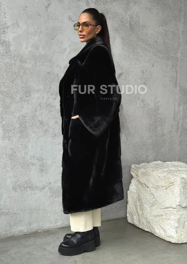 Мех данной шубы аукционная норка, цвет черный. Предлагается в размерах от 42 до 46. Длина модели 115-120 см, что выгодно подчеркивает фигуру девушек. Эта модель идеально подойдет для девушек и женщин, предпочитающих роскошные натуральные меха.