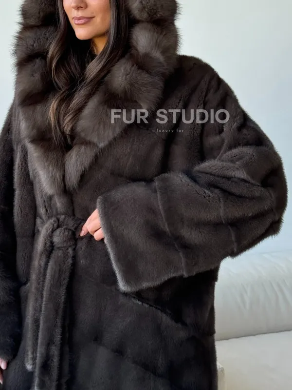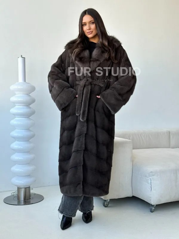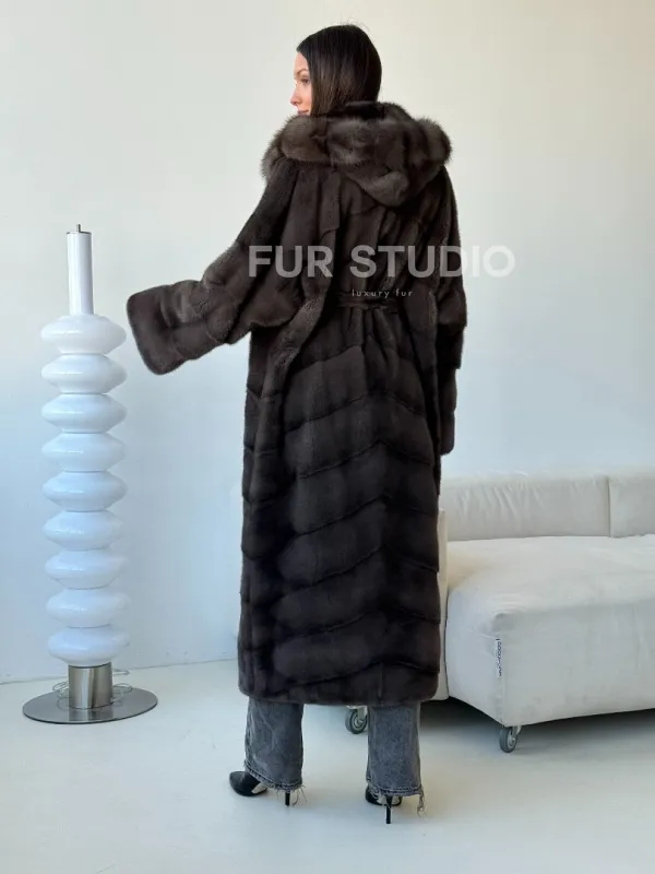 Длинная норковая шуба с капюшоном - графит 102494
