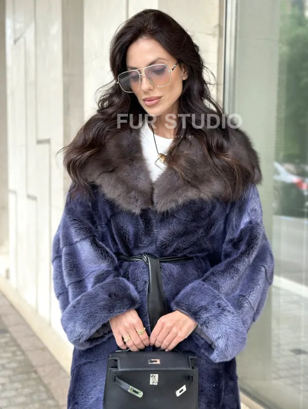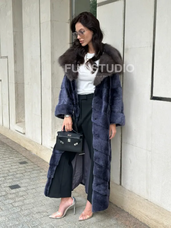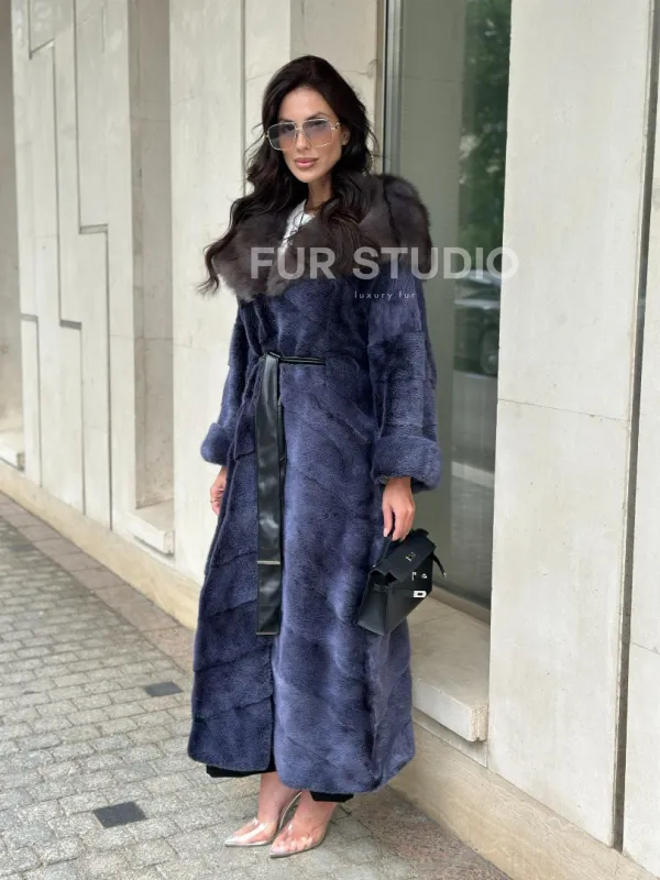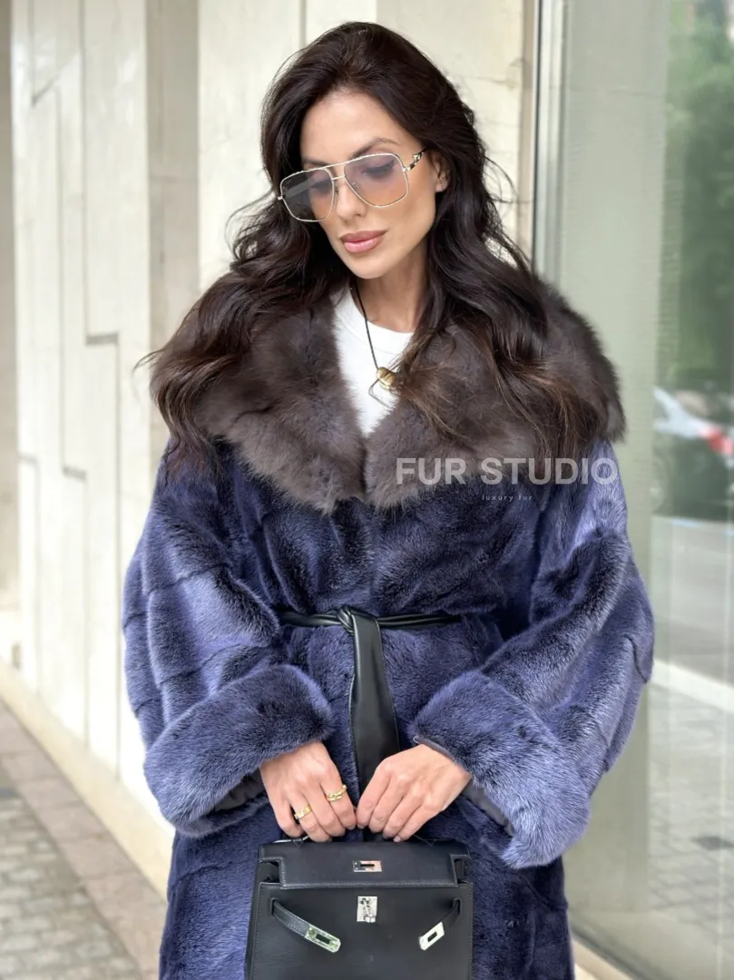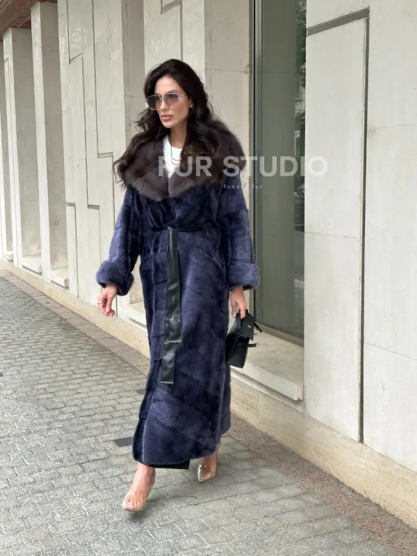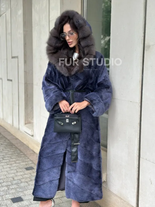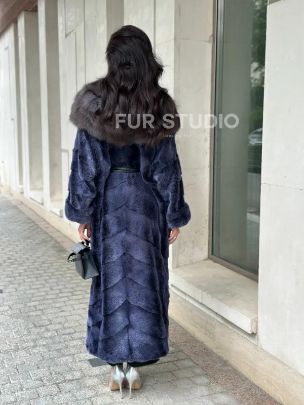 Длинная шуба из норки с капюшоном из куницы - цвет синий графит 100936