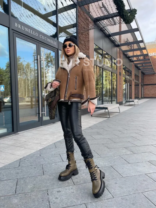 Удобный воротник позаботится о комфортной температуре шеи и подчеркнет ее изгибы. Благородная расцветка выгодно оттенит цвет глаз и волос владелицы. Оригинальный рюкзак и грубая, но стильная обувь будут гармонично сочетаться с образом. Купить дубленку – бомбер со спущенным плечом из натуральной овчины могут молодые девушки, которые хотят выглядеть стильно вне зависимости от времени года.