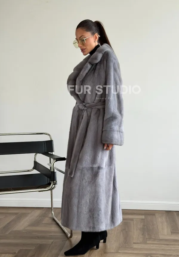 Мех данной шубы аукционная норка, цвет голубой. Предлагается в размерах от 42 до 50. Длина модели 120-125 см, что выгодно подчеркивает фигуру девушек. Эта модель идеально подойдет для девушек и женщин, предпочитающих роскошные натуральные меха.