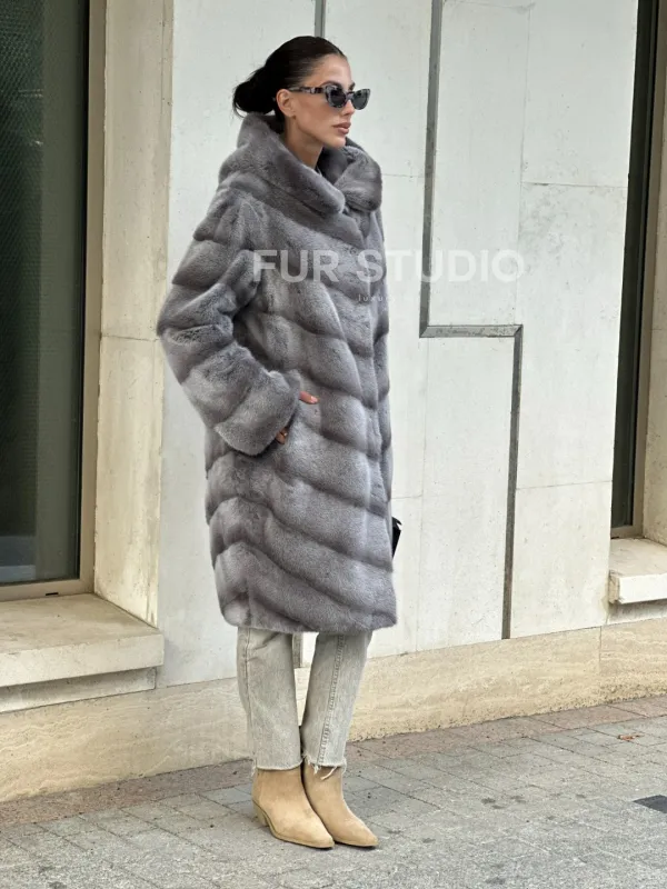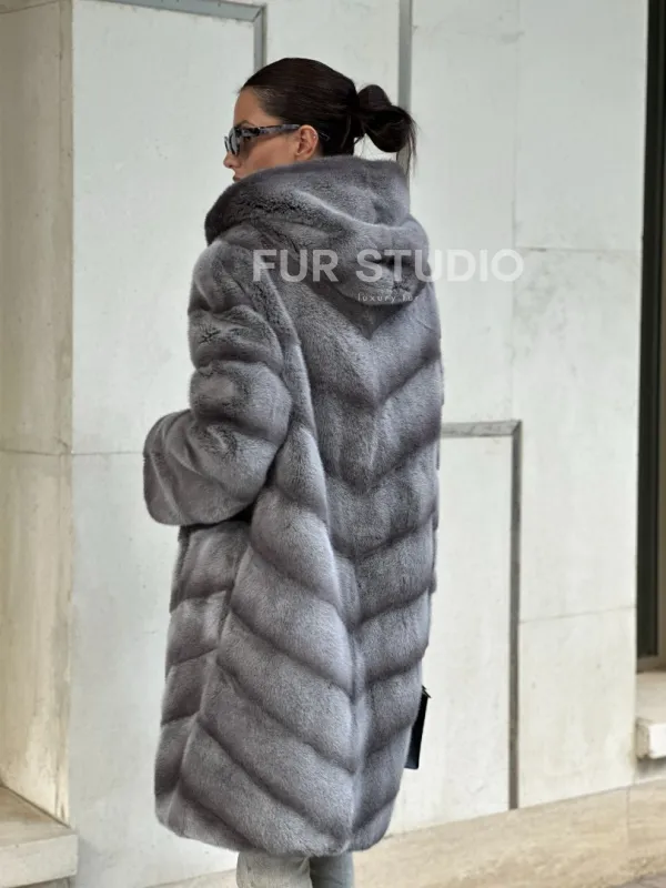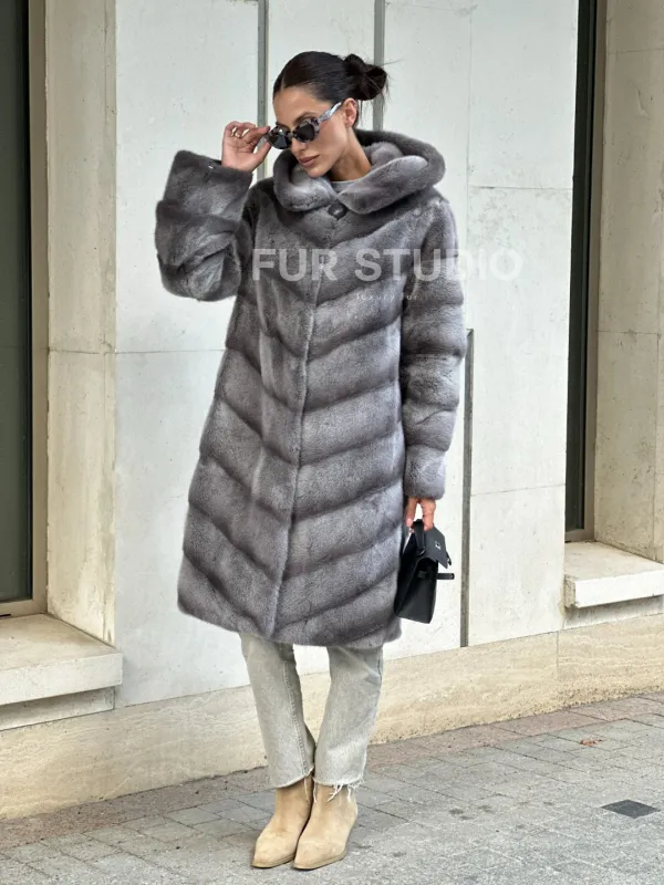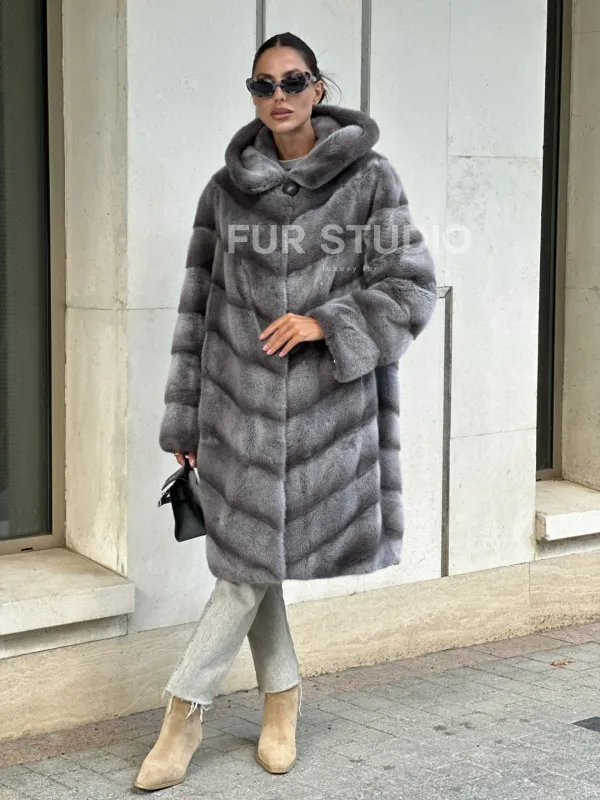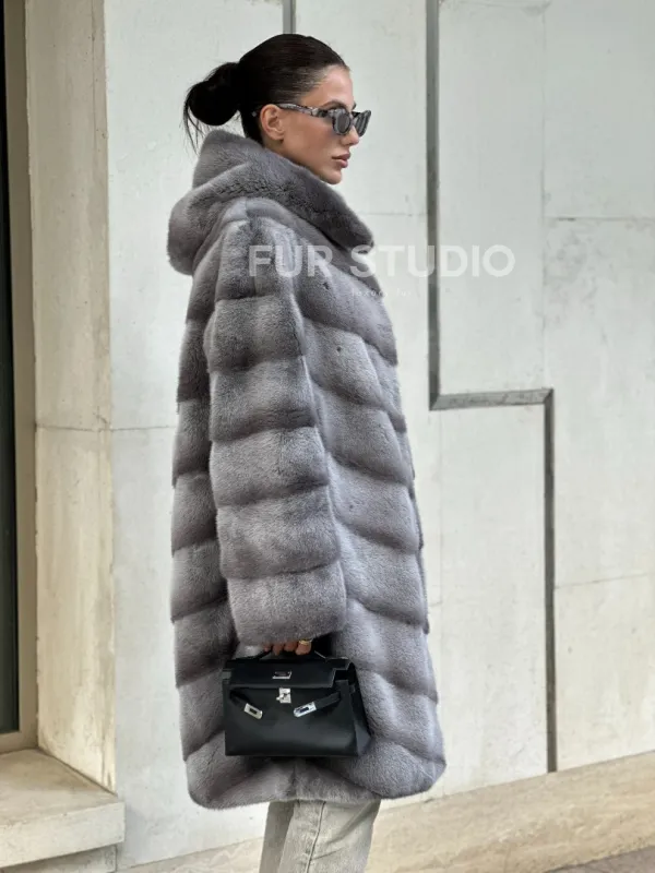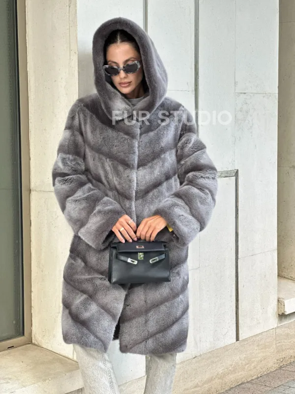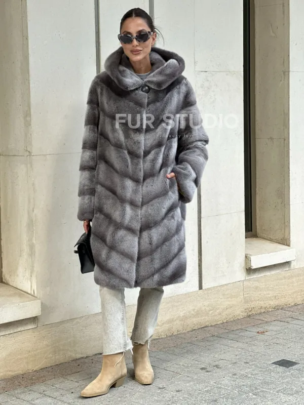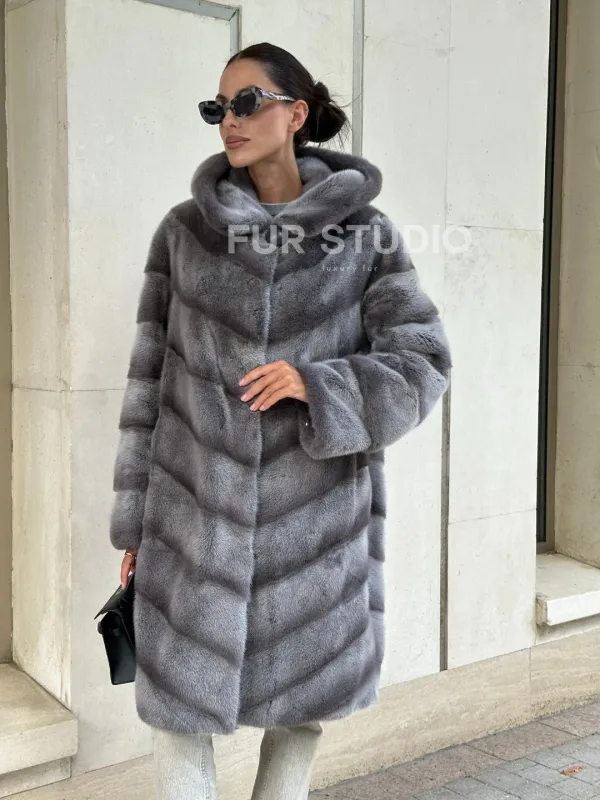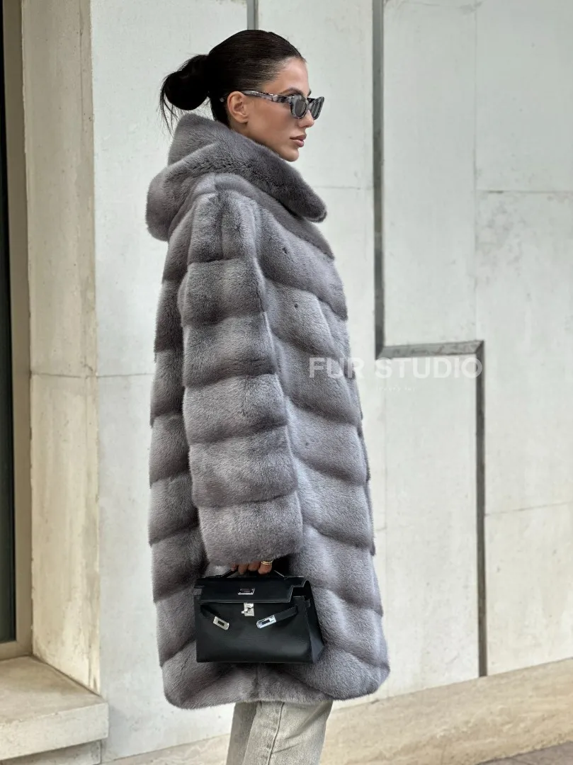Норковая шуба с капюшоном - цвет PLATINUM (СЕРЫЙ) 100982