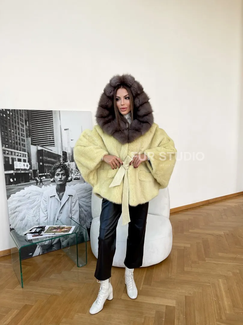 Норковое пончо с капюшоном из меха куницы 100170