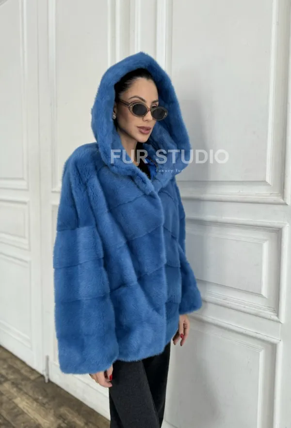 Норковый полушубок с капюшоном, паркет - цвет васильковый 100865