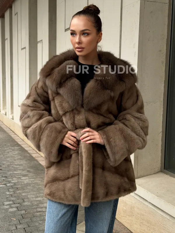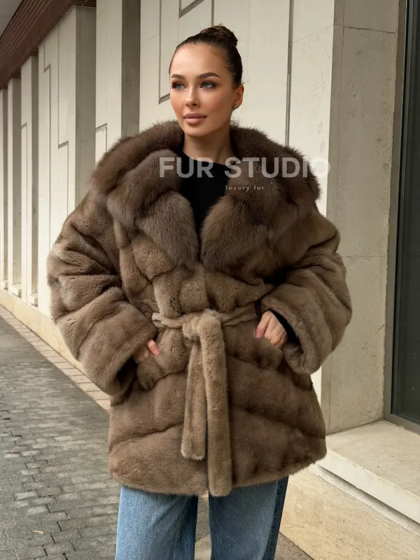 Полушубок норковый с капюшоном из меха куницы 102577