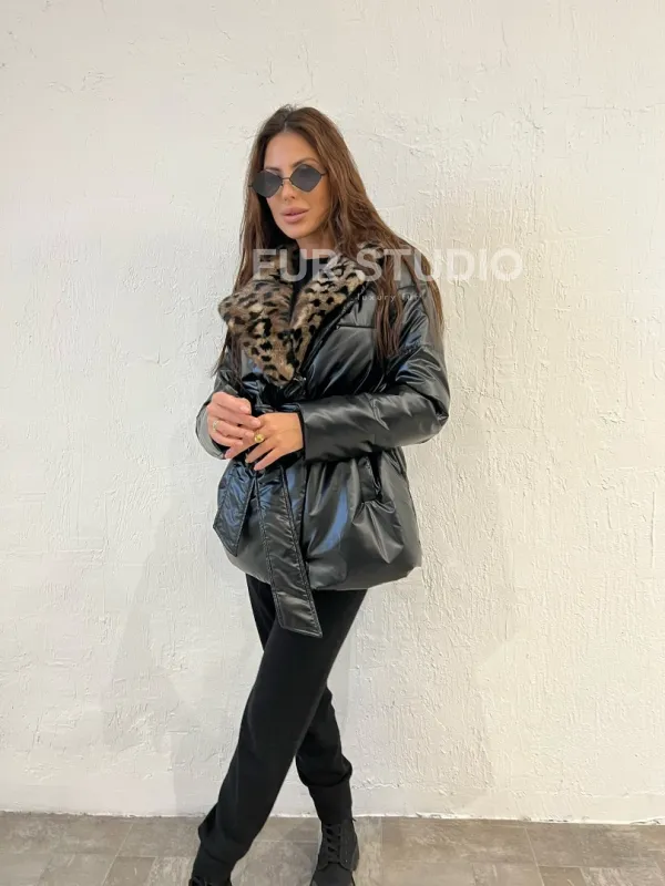 Модель идеальна для дам любого возраста. Длина оптимальна и комфортна для повседневной носки. Необычный пояс выделяет талию и делает силуэт хрупким. Изделие подходит к стилю casual, вечернему наряду. Купить пуховик с мехом норки в анималистическом принте - это отличное соотношение цена/качество.
