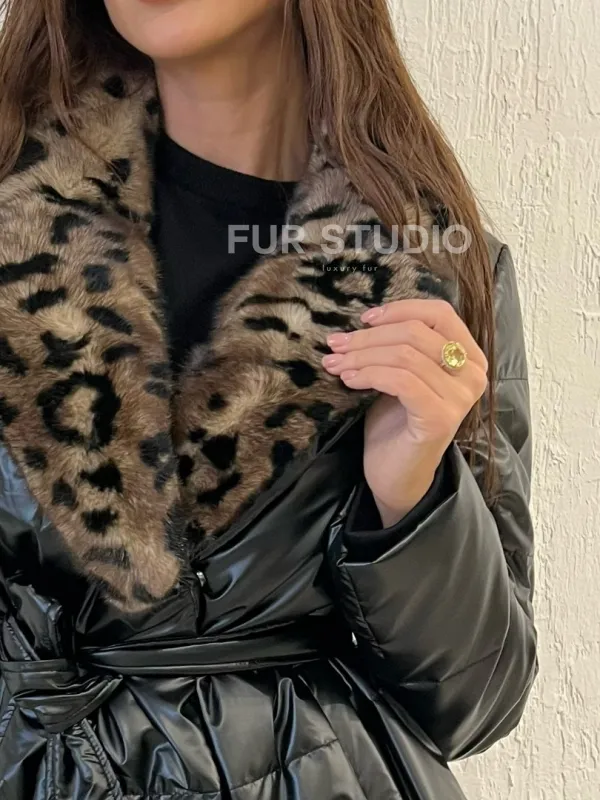 Пуховик с мехом норки в анималистическом принте 100391