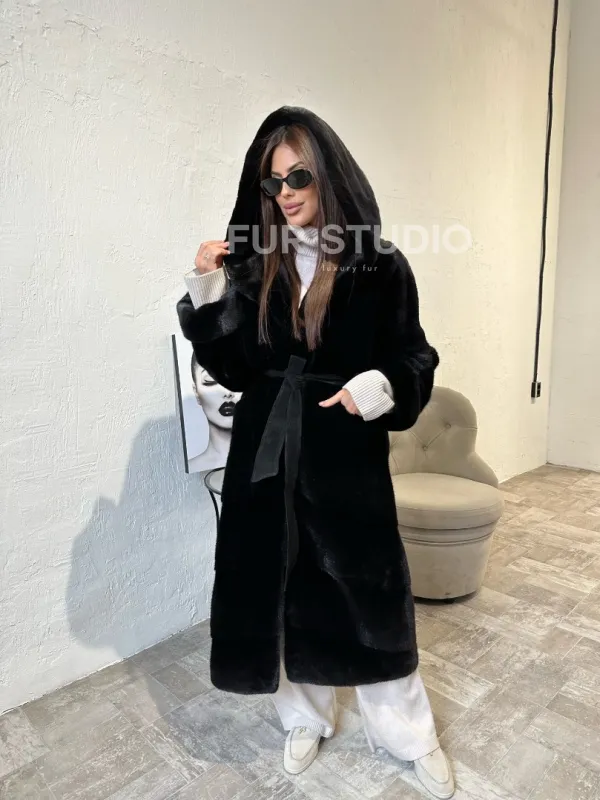 Шуба из канадской плюшевой норки BlackNafa с капюшоном 100349