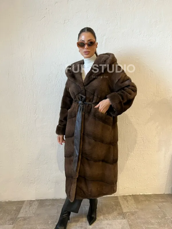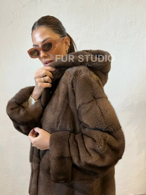 Шуба из меха норки с капюшоном - цвет соболь 100142