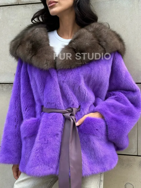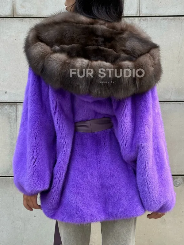 Шуба из норки Violet с капюшоном из меха куницы 101030