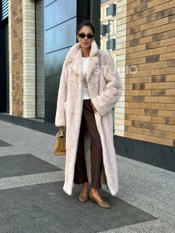 Мех данной шубы аукционная норка , цвет розовый. Предлагается в размерах от 42 до 52. Длина модели 125-130 см, что выгодно подчеркивает фигуру девушек. Эта модель идеально подойдет для девушек и женщин, предпочитающих роскошные натуральные меха.