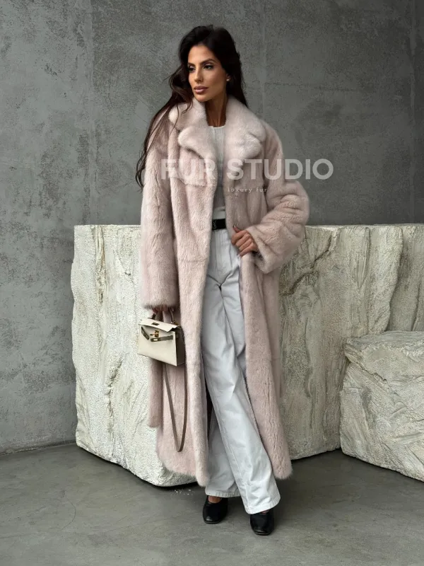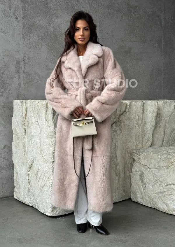 Мех данной шубы аукционная норка , цвет бежевый. Предлагается в размерах от 42 до 50. Длина модели 125-130 см, что выгодно подчеркивает фигуру девушек. Эта модель идеально подойдет для девушек и женщин, предпочитающих роскошные натуральные меха.